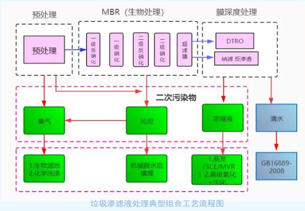 “生化+雙級DTRO”和“生化+MBR+納濾(NF)+反滲透(RO)”膜處理工藝,是目前國內(nèi)垃圾滲濾液行業(yè)除氨氮采用的主流技術(shù)。垃圾滲濾液經(jīng)過前端生化以及混凝沉淀,后經(jīng)兩級DTRO膜或納濾+反滲透等膜工藝進行濃縮分離。