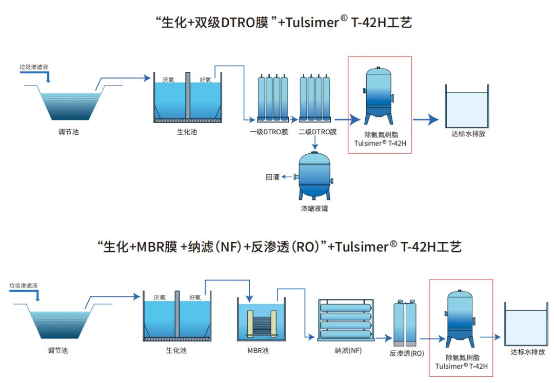 科海思深耕垃圾滲濾液行業(yè)難點、痛點,基于Tulsimer ?T-42H特種除氨氮樹脂的特性,與現(xiàn)有膜處理工藝完美結(jié)合,提出了膜后出水氨氮深度處理解決方案。