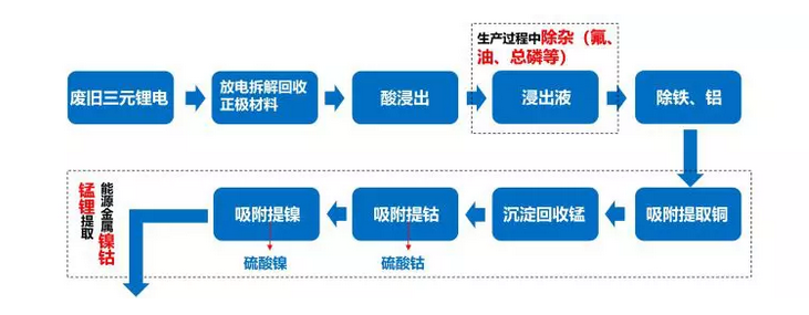 采用濕法工藝,廢料經(jīng)過破碎分選,除去金屬碎片, 通過酸浸、凈化除雜、萃取、分離得到各種目標(biāo)金屬鹽溶液,然后通過共沉淀制備三元前驅(qū)體產(chǎn)品或由氯化鈷制備碳酸鈷,煅燒后制備四氧化三鈷,含鋰萃余液則用來制備鋰鹽產(chǎn)品。
